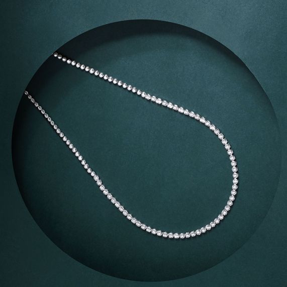 Vibrancy denotes this string design necklace crafted from 14Kt white gold, studded with diamonds