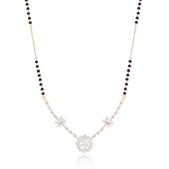 For those who appreciate traditional motifs in a diamond mangalsutra, this 18Kt rose gold floral design is a stunning choice. Expertly crafted, it adds the perfect festive touch to your ensemble.
