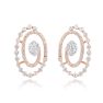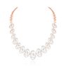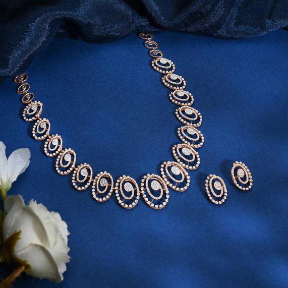 This 18Kt rose gold necklace set showcases a stunning spiraled circle, studded with radiant diamonds for a distinctive touch. A true statement piece, it enhances any ensemble, making you the center of attention wherever you go.