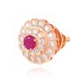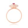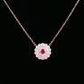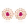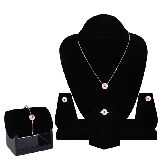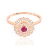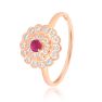 This exquisite 18Kt yellow gold necklace set features a pendant necklace, earrings, ring, and bracelet, each showcasing a striking red hydro stone and brilliant diamonds. The detailed floral motif design adds a touch of timeless elegance, making it the ideal jewel to elevate your festive collection.