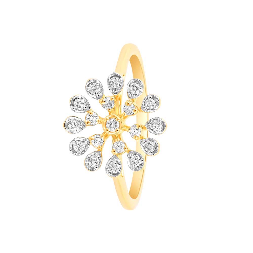 This 14Kt yellow gold ring features a blooming floral design at the center, adorned with sparkling diamonds for an added touch of elegance. Perfect for everyday wear, its delicate yet vibrant design brings a timeless charm, effortlessly enhancing your look.