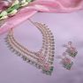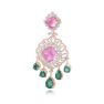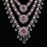 This handmade 18Kt rose gold necklace set is a true masterpiece, featuring Created Pink Tourmaline Sugar Loaf and Created Green Emerald, with intricate floral motifs and sparkling diamonds. A perfect heirloom, it’s designed to be passed down through generations, offering timeless elegance and enduring beauty.