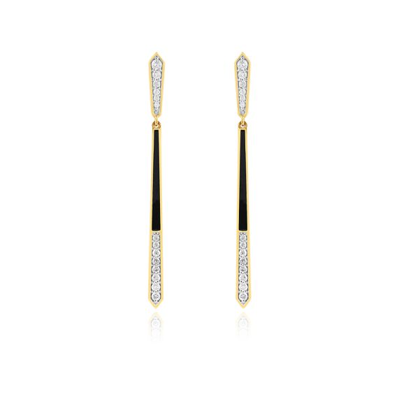 Bold yet elegant, these 14Kt yellow gold drop earrings feature a sleek vertical design with glossy black enamel and a trail of sparkling diamonds. The contrast of deep enamel and brilliant stones creates a dramatic silhouette - perfect for evenings that call for effortless sophistication.