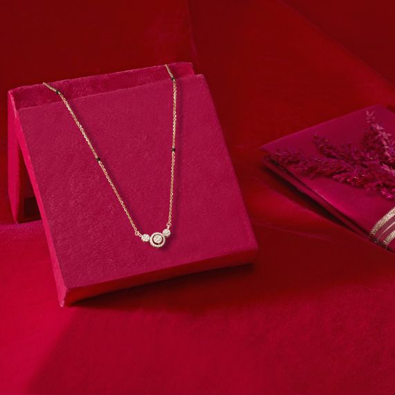 Crafted in 18Kt yellow gold is this diamond encrusted tanmaniya with chain, jewellery that is both elegant and versatile