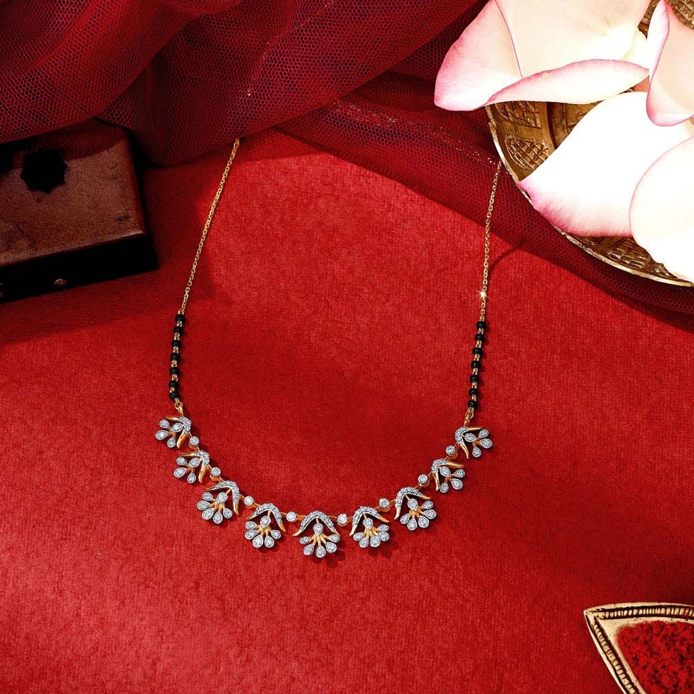 This delicate nature-inspired mangalsutra necklace in 18Kt yellow gold, lends the perfect look to an elegant celebration of style and substance
