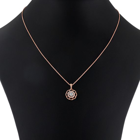 This classic floral design pendant in 18Kt rose gold, is the perfect accessory to wear for a chic and effortless look this festival