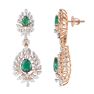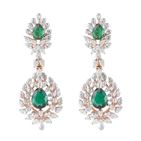 The sculptural design of this rose gold dangler earrings with diamonds and emeralds is both traditional and timeless, making it a festive piece that can be worn for years to come.