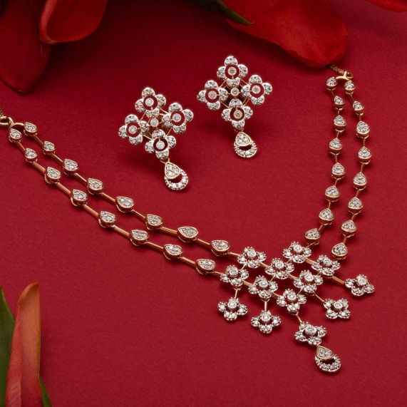 The perfect finishing touch to your occasion wear, is this 14Kt rose gold Astra necklace set studded with clover design diamonds