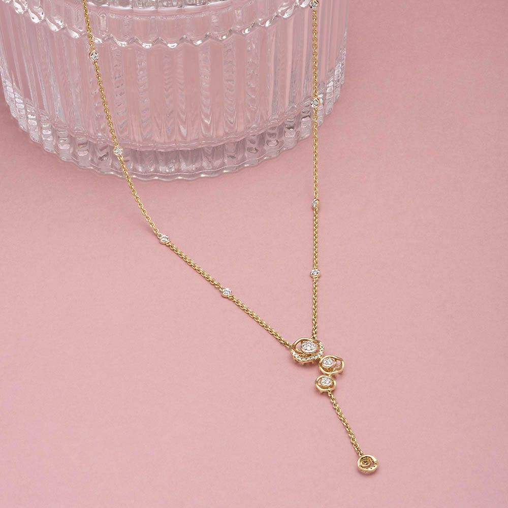 Showcase yourself at an important engagement in your best with this elegant diamond lariat necklace set into 14Kt yellow gold, sure to grab all attention!